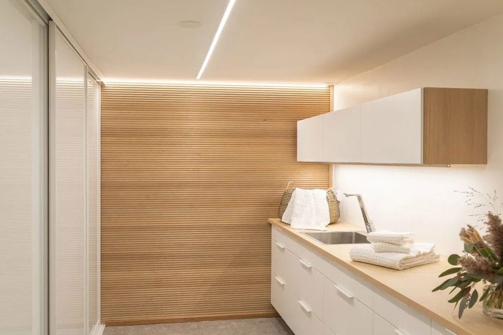 نصب روکش یا پانل عمودی میتواند چشم را به سمت بالا جلب کرده و تأثیر سقفهای بلندتر را ایجاد کند. به استفاده از تکنیکهایی مانند shiplap یا قاب بندی عمودی برای آشکار سازی ارتفاع اتاق توجه کنید.