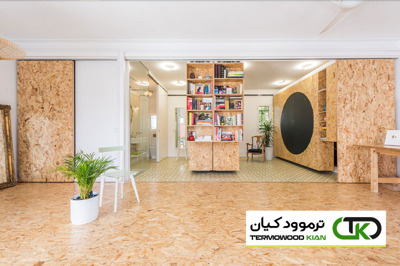 OSB برای استحکام و صرفهجویی در هزینه شناخته شده است. در حالی که پانلهای OSB بیشتر به عنوان پوشش به عنوان یکی از بسیاری از لایههای نامرئی یک ساختمان استفاده میشوند، بسیاری از طراحان نیز پتانسیل آنها را در طراحی داخلی کاوش کردهاند. تختههای فیبر با چگالی متوسط (MDF) دارای سطوح صاف هستند و به مادهای مورد ترجیح برای نجاری تبدیل شدهاند، در حالی که تختههای ذرات با چگالی متوسط (MDP) از ضایعات چوب مانند خاک اره مخلوط با رزین استفاده میکنند و راهحلی کمهزینهتر ارائه میدهند. تختههای پلیوود به طریقی مشابه به CLT فرآوری میشوند، اما در مقیاسی متفاوت، ایجاد شده توسط همپوشانی ورقهای چوبی که عمود بر هم چسبیده و فشار حرارتی داده میشوند.