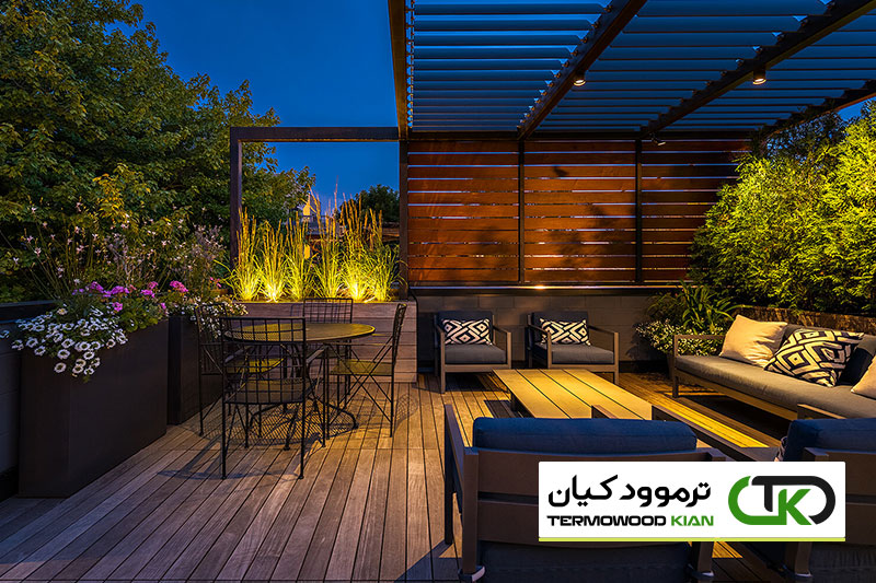 - جذابیت بصری بالا: رنگ طبیعی و بافت گرم ترموود میتواند جلوهای دلنشین و دعوت کننده به فضای روف گاردن بیفزاید.